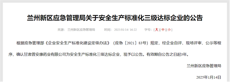 近日,经兰州新区应急管理局组织专家组对农垦药材公司所属甘肃普安康药业有限公司安全生产体系建设、目标职责、制度化管理、安全教育培训、现场管理、风险分级管控和隐患排查治理双重预防机制建设、应急管理等七个方面进行现场综合评审,最终普安康药业顺利通过安全生产标准化三级达标企业审核。