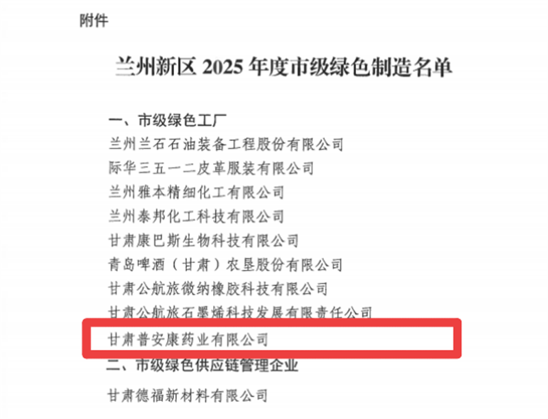 近日,兰州新区工信和数据局公布了《2025年度市级绿色制造名单》,甘肃农垦药材公司新区子公司普安康药业成功获评市级“绿色工厂”称号,在践行绿色发展理念、构建现代化产业体系的道路上再迈新台阶。